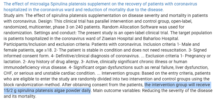 The Persian team designed a randomized controlled trial (IRCT20210216050373N1) investigating the research hypothesis: can high dose Spirulina supplement reduce COVID-19-related mortality or accelerate hospital discharge within seven days; secondary endpoint involved overall discharge or mortality?